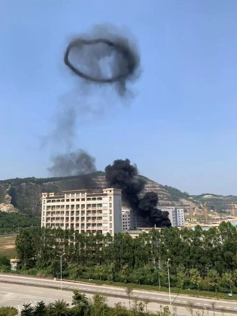 Industrial Park in Daling, Dongguan! Hey! Smoke billowing from the scene! Black smoke! The sky was blown black!